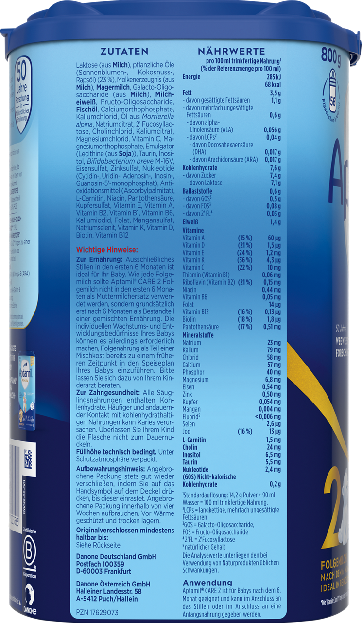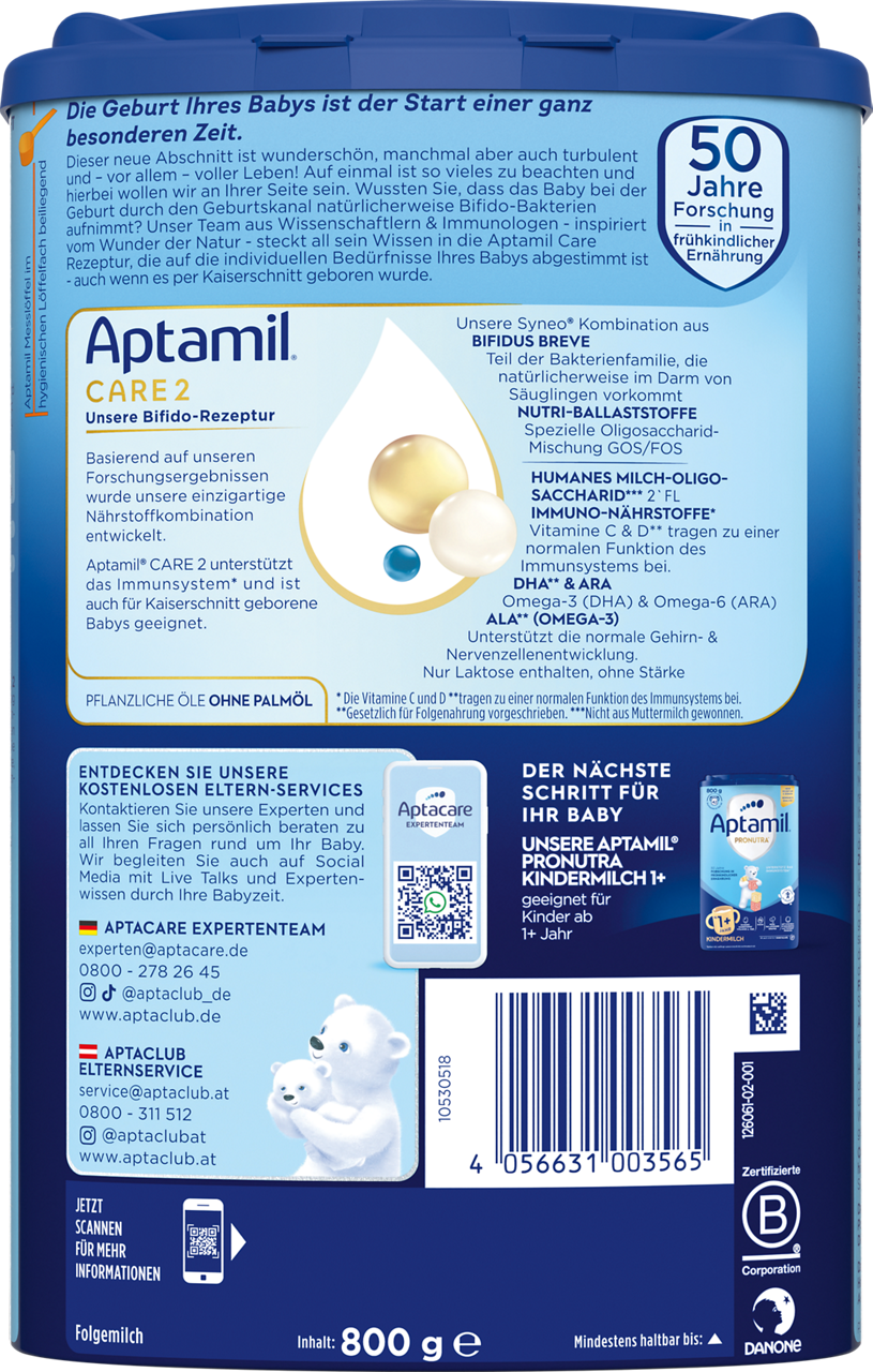- Zusätzlich enthält Aptamil Care 2 hochwertige humane Milch-Oligosaccharide 2´FL und unterstützt mit den Immuno-Nährstoffe Vitamin C&D das Immunsystem