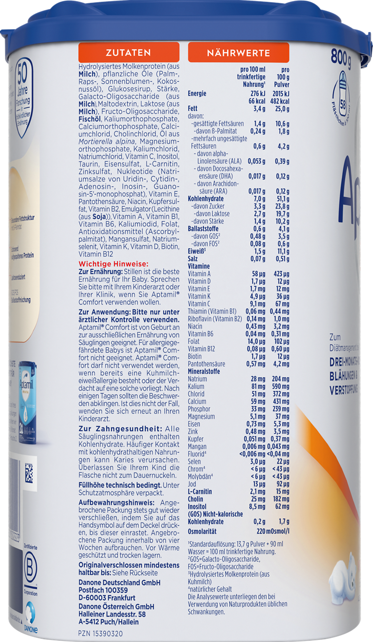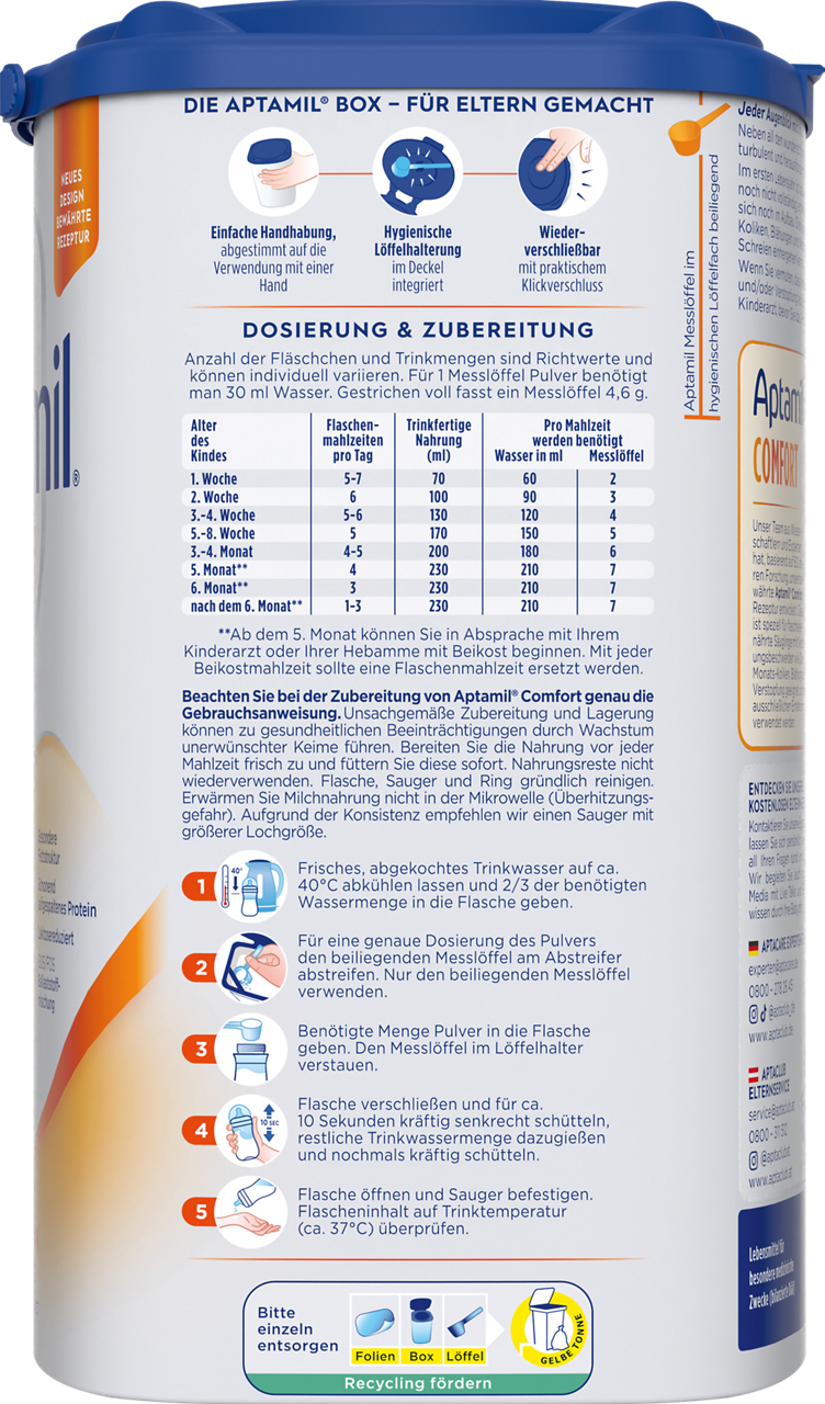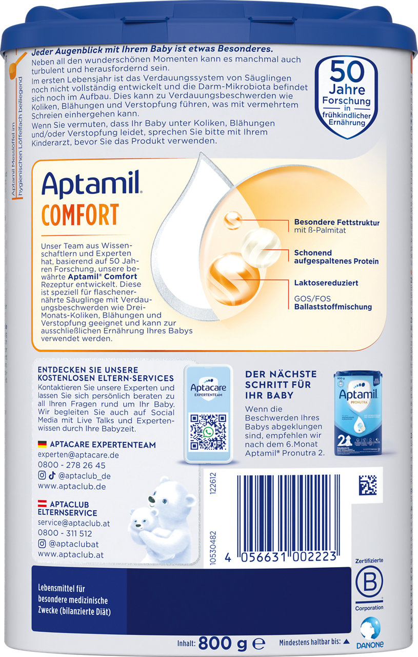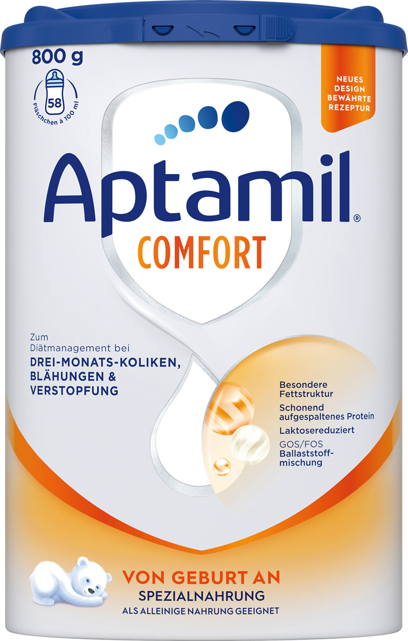 Aptamil Comfort ist ein Lebensmittel für besondere medizinische Zwecke (bilanzierte Diät). Nur unter ärztlicher Aufsicht verwenden. Aptamil Comfort ist von Geburt an zur ausschließlichen Ernährung von Säuglingen geeignet. Bitte Hinweise auf der Packung beachten.